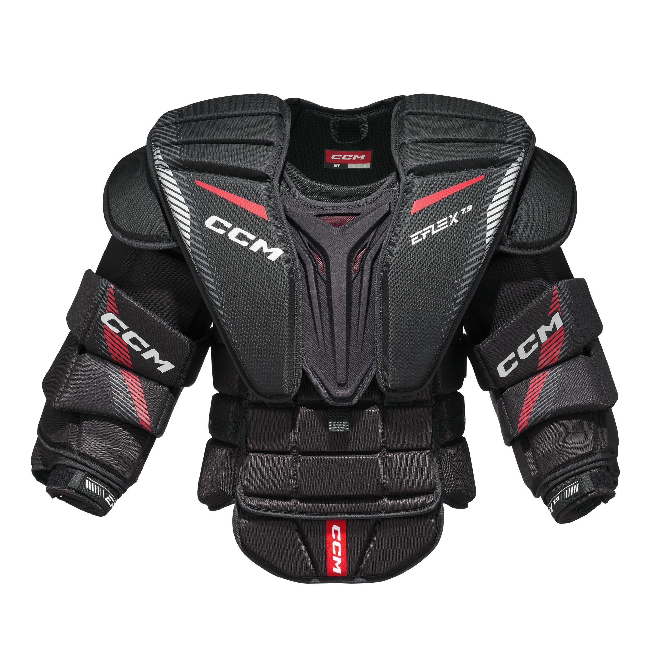 Defend your crease with the CCM EFLEX 7.9 chest protector, designed for goaltenders seeking an optimal combination of coverage, protection and flexibility. Key features include the Max Flex Fit design for increased net presence with mobility and the ADPTFIT adjustable elbow system for a comfortable and secure fit. The AER-TEC ventilation system provides excellent temperature regulation through perforated foams and mesh. Molded HD foam and extended rib protection protect key areas, and strategic flex points ensure a full range of motion. Multiple adjustment points and a removable lower belly piece allow for a fully personalized fit to optimize comfort, protection and performance.